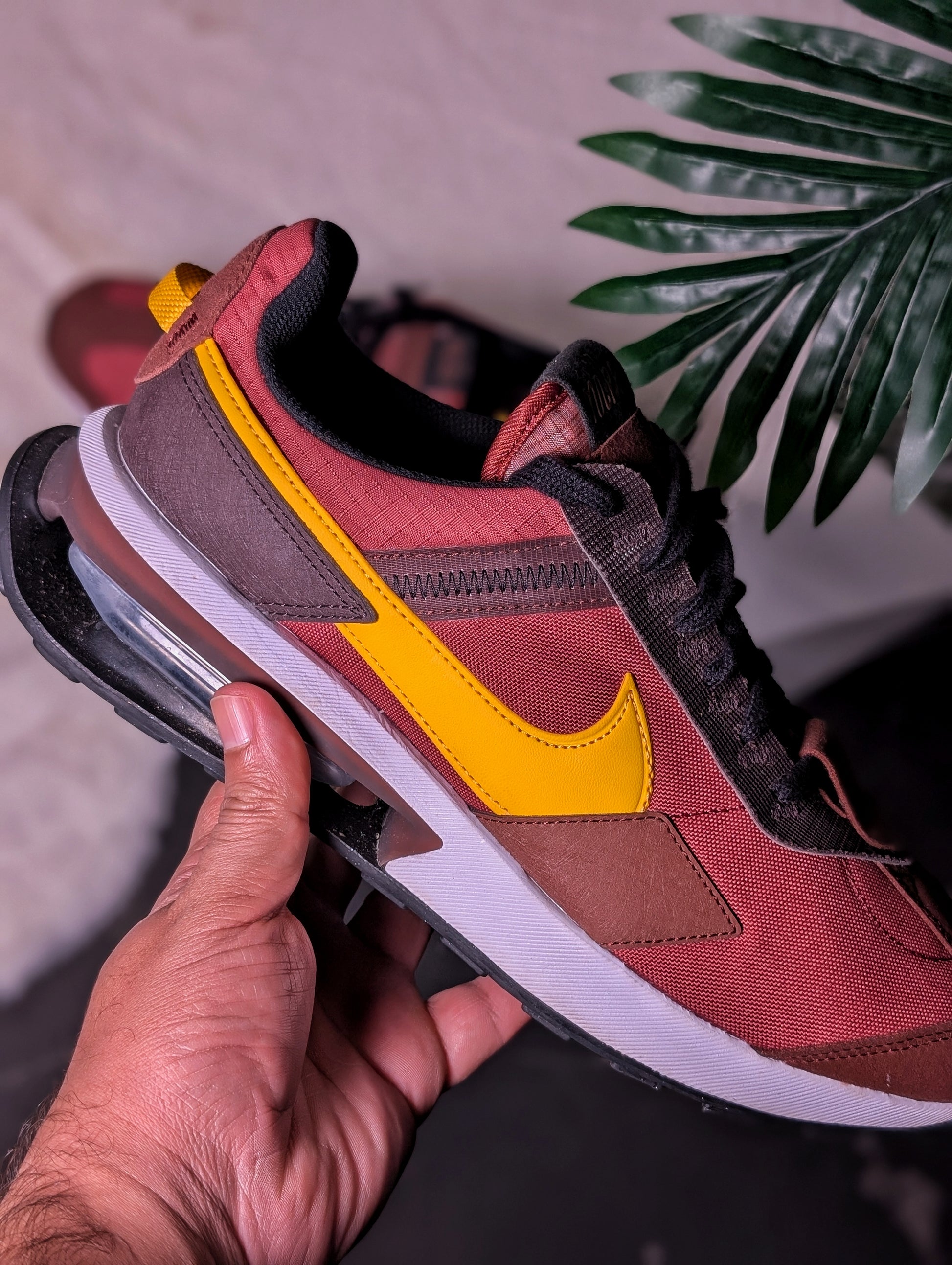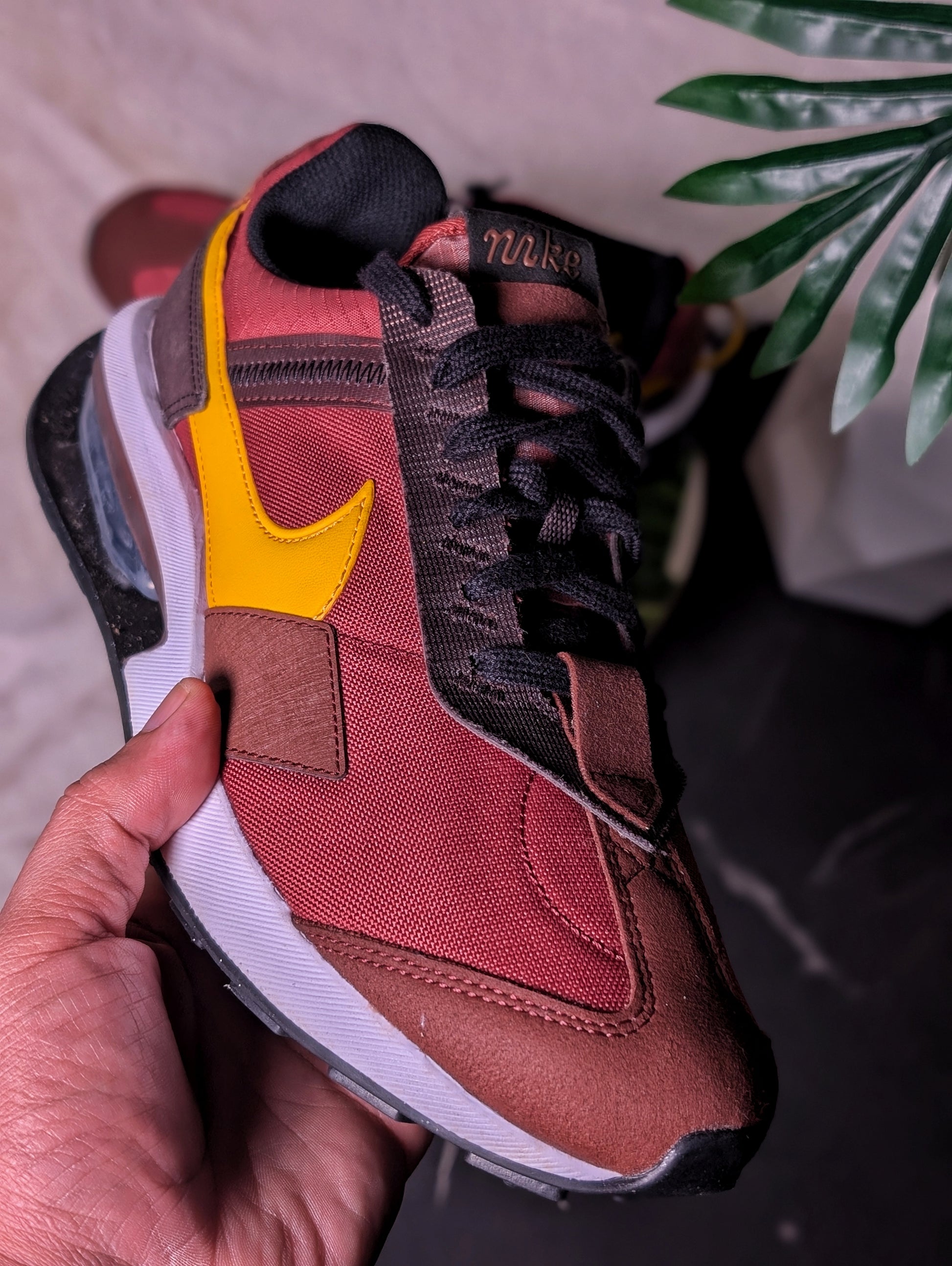 الموديل والديزاين: سبردينة من نوع Nike Air Max (باينة من الـ Air bubble في الكعب)، تتميز بمزيج من الألوان الدافئة: الـ Bordeaux (عنابي)، البني، واللون الأصفر (Mustard) في علامة الـ Nike Swoosh.